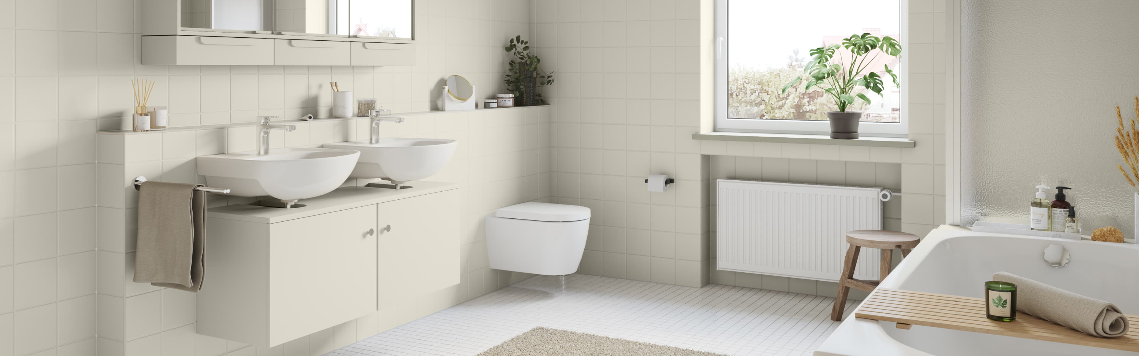 Geben Sie Ihrem Bad einen schönen neuen Look im eleganten Modern-Stil – hier mit dem Alpina Bad & Küche Fliesen-Lack im Farbton „Schiefer“ für die Wandfliesen und „Granit´“ für die Bodenfliesen, dem 3in1 Fliesen-Lack in „Baumwollweiß“ für die Duschtasse, dem Möbel-Lack in der Nuance „Vulkangestein“ für den Waschtisch sowie der Wand-Farbe im Farbton „Treibholz“.
