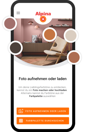 Machen Sie zur Farbbestimmung ein Foto oder laden Sie vorhandene Bilder aus Ihrer Bildergalerie hoch. Tippen Sie auf die Bereiche, deren Farbtöne Sie bestimmen wollen und diejenigen Alpina Farbtöne, die Ihrer Auswahl am ähnlichsten sind, werden automatisch angezeigt.