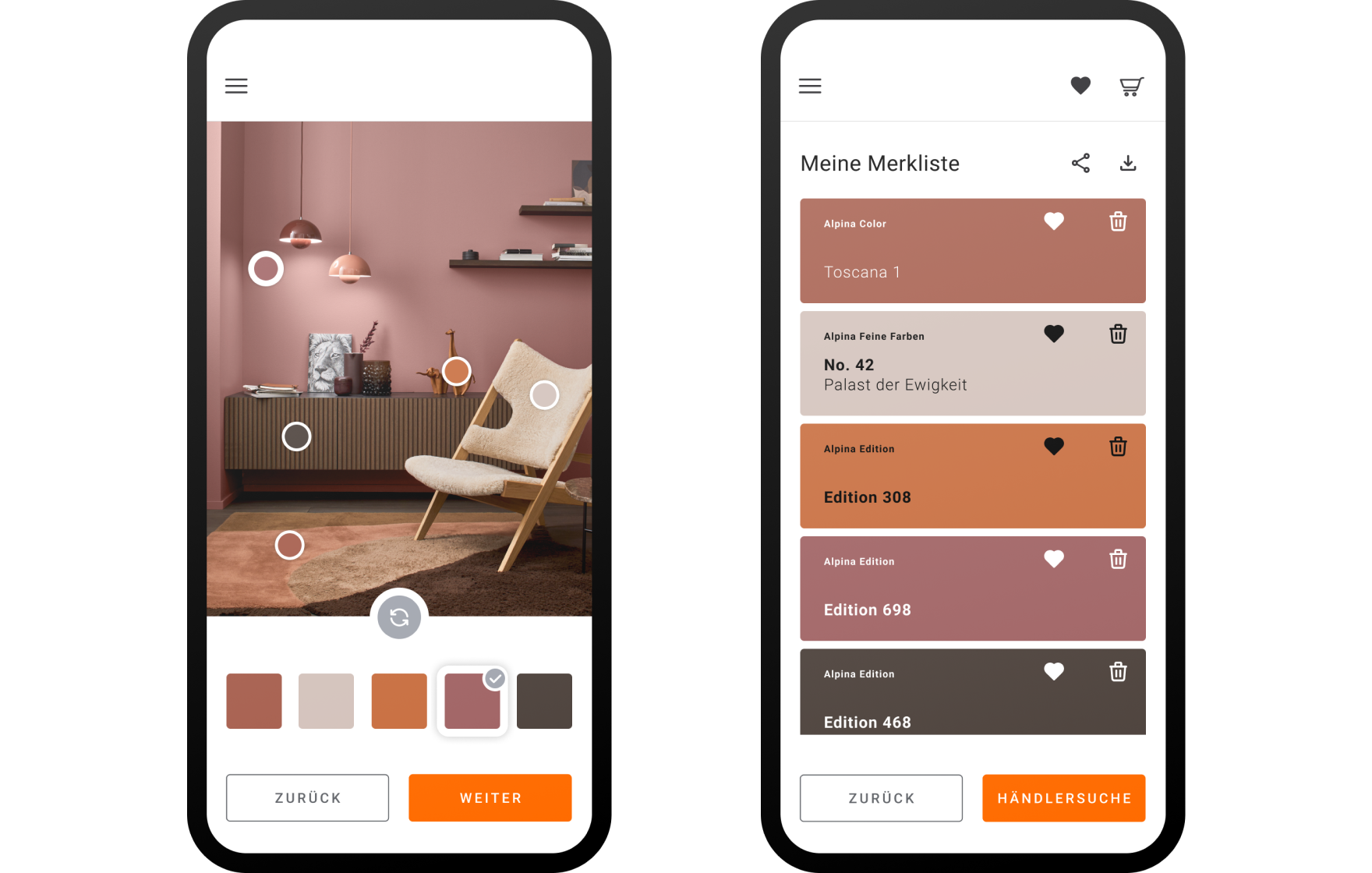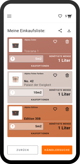 In der Alpina Farbraum App können Sie Ihre Alpina Lieblingsfarbtöne auf Ihre Einkaufliste setzen und darüber hinaus auch die benötigte Farbmenge berechnen. Je nach Produkt können Sie Ihre Farbtöne direkt über angeschlossene Handelspartner online kaufen oder mit der Händlersuche Ihren nächstgelegenen stationären Händler finden.