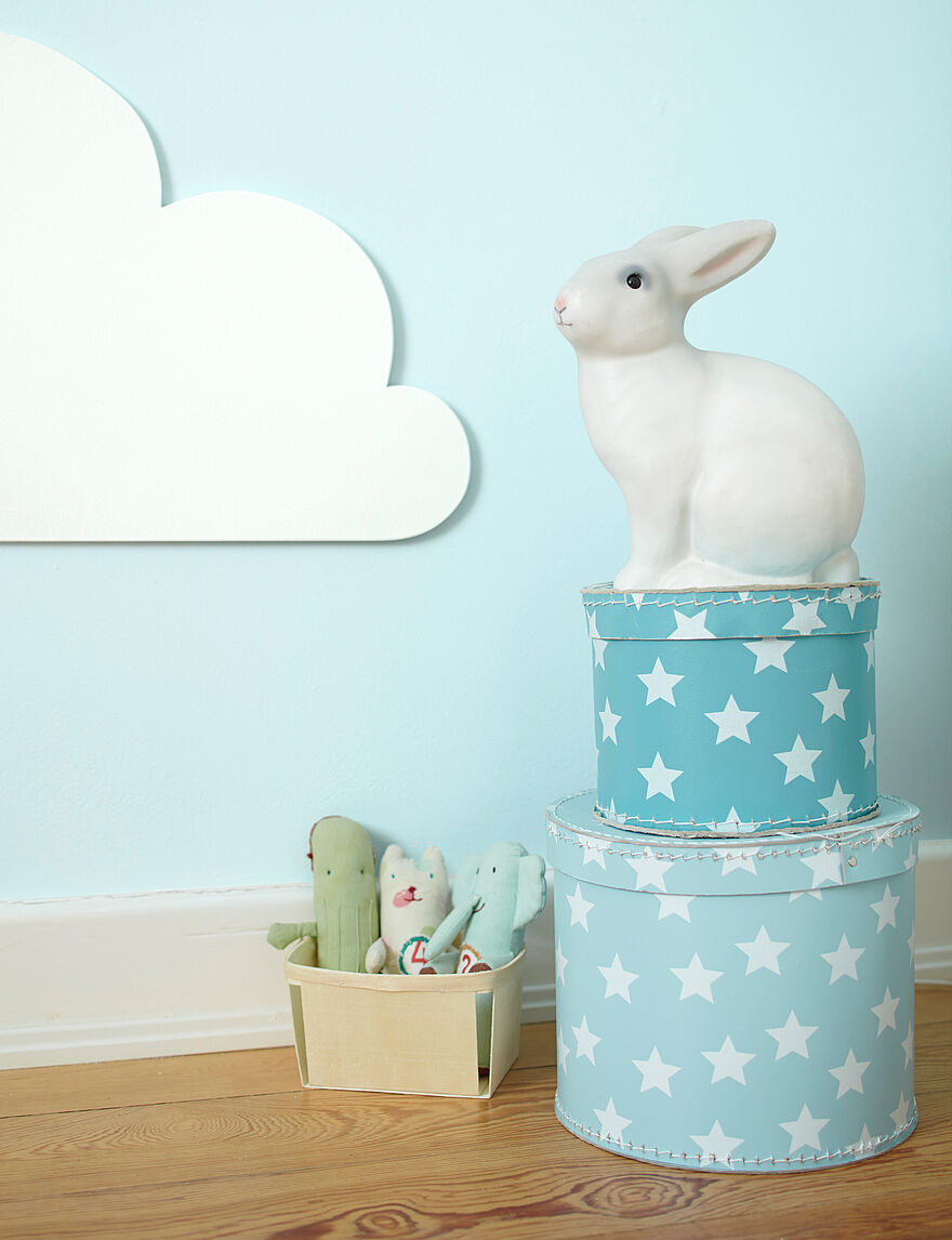 Ein Babyzimmer ohne Spielsachen ist undenkbar. Aber wie lassen sich all die geliebten kleinen und großen Dinge sauber verstauen, so dass das Babyzimmer am Ende eines langen Tages aufgeräumt und beruhigend wirkt? Eine praktische Lösung für das Babyspielzeug sind große Stauraum-Kisten. Damit ist das Kinderzimmer nicht nur in Windeseile aufgeräumt – das Baby kann beim Aufräumen spielerisch mithelfen und selbst Spielsachen in die Kiste werfen. Darf wieder gespielt werden, sind die großen Spielzeugbehälter wahre Schatzkisten, die die Babys mit Begeisterung durchforsten. Mehr Aufbewahrungsideen für das Baby- und Kinderzimmer finden Sie hier.