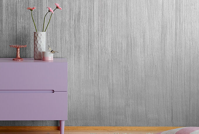Grundsätzlich gilt: Je dunkler bzw. kräftiger die gewählte Wandfarbe, desto stärker bleibt der Ursprungston erhalten. Üblicherweise trägt man den Effekt auf eine strukturierte Oberfläche, vorgestrichen z.B. mit Linien-Effekt, auf. Auch eine bereits gestrichene Fläche können Sie mit der Metallic Wandfarbe veredeln. Hier lässt sich am besten mit der Alpina Bürste eine individuelle Struktur erarbeiten. Bitte beachten Sie jedoch, dass die Farbe des Untergrunds immer durchscheint, da die Effektfarbe nicht komplett deckend ist. Es empfiehlt sich, den Effekt zunächst an einer unauffälligen Stelle zu testen.