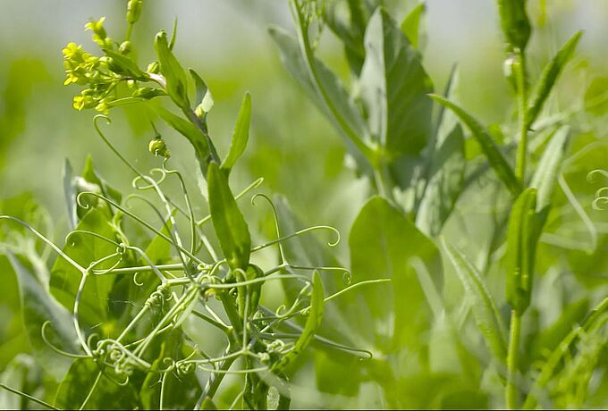 - reduziert den Einsatz von Spritzmitteln, da Leindotter Unkraut unterdrückt. Außerdem stützt sie die Erbsenpflanze und hilft ihr beim Ranken.