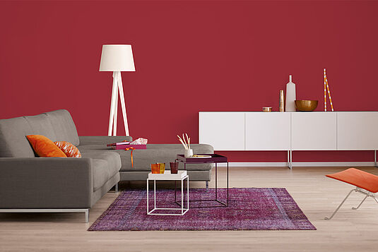 Tiefes Rot ist eine starke Farbe, die eine kraftvolle Atmosphäre erzeugt. Genau deshalb sollte die Farbe lediglich als Akzent eingesetzt werden. Als Begleitfarben eignen sich zartes Gelb oder auch helles Grau. Gelb intensiviert tiefes Rot, wohingegen Grau seine Wirkung dezent abmildert.
