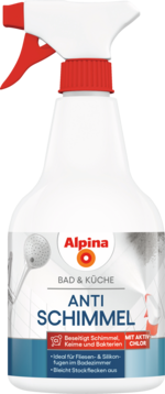 Dank Aktiv-Chlor entfernt Alpina Bad & Küche Anti-Schimmel kraftvoll Schimmel und Stockflecken und sorgt gleichzeitig für eine bleichende Wirkung auf allen abwaschbaren Oberflächen. Perfekt geeignet für Sanitärbereiche, Saunen und Schwimmbäder.