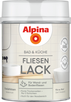 Alpina Bad & Küche Fliesen-Lack schafft zeitgemäße, farbige Gestaltung von Fliesen in Bad und Küche ohne Neuverfliesung. Kann ohne Anschleifen der Fliesen lackiert werden und benötigt weder Grundierung noch Versiegelung.