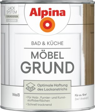 Alpina Bad & Kpche Möbel-Grund sorg als Grundlage auf alten Möbeoberflächen in Küche & Bad für eine starke Verbindung mit der anschließend erfolgenden Lackierung mit Alpina Bad & Küche Möbel-Lack.