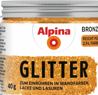 Mit Alpina Glitter ist es möglich, Wandfarben, Lacken und Lasuren einen glitternden bzw. schimmernden Effekt zu verleihen. Durch Alpina Glitter werden die kreativen Möglichkeiten im Farbsortiment um ein Vielfaches erweitert – als Wandfarbe, für Möbel usw.