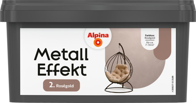 Mit den Metallic Farbtönen Metall Effekt in Gold, Silber oder Roségold kannst du in deinem Zuhause edel und luxeriös anmutende Akzente setzen. Oder du sorgst mit unserem Rost Effekt im Aussehen von schön gealtertem Eisen für einen warmen und nostalgischen Look.