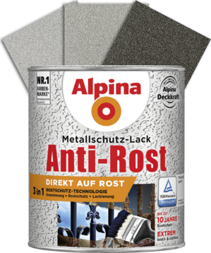Die 3in1 Rostschutz-Technologie (Grundierung + Rostschutz + Lackierung) der Alpina Metallschutz-Lacke vereint eine ausgezeichnet haftende Grundierung mit einem wirkungsvollen Langzeit-Korrosionsschutz und einer dickschichtigen Lackierung. Dadurch und durch die Anwendung direkt auf Rost verringert sich der Zeitaufwand gegenüber herkömmlichen Lacken deutlich.