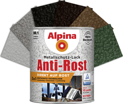 Die 3in1 Rostschutz-Technologie (Grundierung + Rostschutz + Lackierung) der Alpina Metallschutz-Lacke vereint eine ausgezeichnet haftende Grundierung mit einem wirkungsvollen Langzeit-Korrosionsschutz und einer dickschichtigen Lackierung. Dadurch und durch die Anwendung direkt auf Rost verringert sich der Zeitaufwand gegenüber herkömmlichen Lacken deutlich.