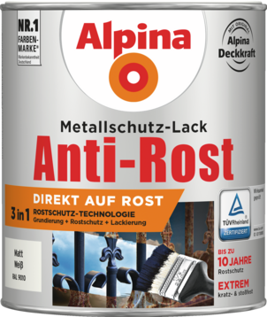 Die 3in1 Rostschutz-Technologie (Grundierung + Rostschutz + Lackierung) der Alpina Metallschutz-Lacke vereint eine ausgezeichnet haftende Grundierung mit einem wirkungsvollen Langzeit-Korrosionsschutz und einer dickschichtigen Lackierung. Dadurch und durch die Anwendung direkt auf Rost verringert sich der Zeitaufwand gegenüber herkömmlichen Lacken deutlich.