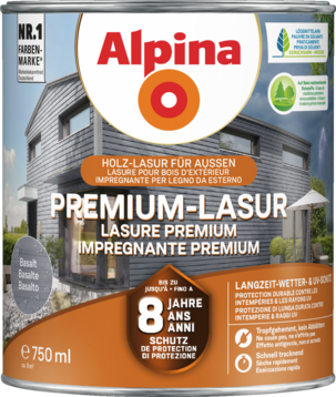 Die Alpina Holz Premium-Lasur wurde durch das Alpina Entwicklungszentrum in Österreich für raue Witterungsbedingungen wie im Alpenraum formuliert und bietet bis zu 8 Jahre intensiven Langzeit-Wetterschutz. Diese seidenmatte Premium-Mittelschichtlasur schützt mittels UV-reflektierenden Farbpigmenten vor Vergrauen und ist extrem Wasser abweisend. Hochwertige Harze dringen tief in das Holz ein und bilden mithilfe eines widerstandsfähigen Bindemittels einen dauerflexiblen Schutzfilm. Die Lasur ist tropf- und spritzgehemmt, leicht zu verstreichen und ideal für Über-Kopf-Arbeiten.