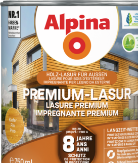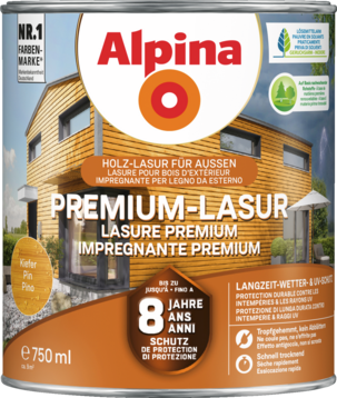 | Untergrund | Alpina Holz Premium-Lasur eignet sich für maßhaltige und begrenzt maßhaltige Bauteile aus Holz wie z.B. Fassaden, Dachgiebel, Holzverkleidungen, Sichtblenden, Carports, Gartenhäuser und Zäune. |