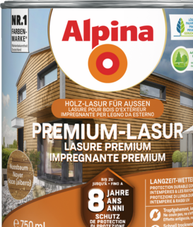 Die Alpina Holz Premium-Lasur wurde durch das Alpina Entwicklungszentrum in Österreich für raue Witterungsbedingungen wie im Alpenraum formuliert und bietet bis zu 8 Jahre intensiven Langzeit-Wetterschutz. Diese seidenmatte Premium-Mittelschichtlasur schützt mittels UV-reflektierenden Farbpigmenten vor Vergrauen und ist extrem Wasser abweisend. Hochwertige Harze dringen tief in das Holz ein und bilden mithilfe eines widerstandsfähigen Bindemittels einen dauerflexiblen Schutzfilm. Die Lasur ist tropf- und spritzgehemmt, leicht zu verstreichen und ideal für Über-Kopf-Arbeiten.