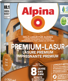Die Alpina Holz Premium-Lasur wurde durch das Alpina Entwicklungszentrum in Österreich für raue Witterungsbedingungen wie im Alpenraum formuliert und bietet bis zu 8 Jahre intensiven Langzeit-Wetterschutz. Diese seidenmatte Premium-Mittelschichtlasur schützt mittels UV-reflektierenden Farbpigmenten vor Vergrauen und ist extrem Wasser abweisend. Hochwertige Harze dringen tief in das Holz ein und bilden mithilfe eines widerstandsfähigen Bindemittels einen dauerflexiblen Schutzfilm. Die Lasur ist tropf- und spritzgehemmt, leicht zu verstreichen und ideal für Über-Kopf-Arbeiten.