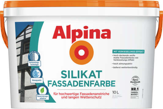 Alpina Silikat Fassadenfarbe schützt Ihr Haus über viele Jahre wirkungsvoll gegen Wind und Wetter. Die wasserabweisende Wirkung schützt das Mauerwerk gegen eindringenden Regen. Gleichzeitig sorgt die hohe Wasserdampfdurchlässigkeit des Anstrichs dafür, dass Feuchtigkeit schnell aus dem Mauerwerk in die Luft entweichen kann. Anstriche mit Alpina Silikat FassadenFarbe sind äußerst wirtschaftlich, da durch die Möglichkeit der Verdünnung mit Alpina Silikat FassadenGrund auf tragfähigen, festen Untergründen in den meisten Fällen auf eine spezielle Grundierung verzichtet werden kann. Alpina Silikat FassadenFarbe ist ergiebig, wasserverdünnbar, geruchsarm und umweltschonend, weil schadstoffarm