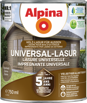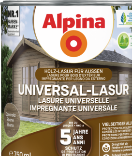 Alpina Holz Universal-Lasur ist der Allwetterschutz für eine Vielzahl von Holzobjekten. Hochwertige Alkydharze schaffen einen Schutz von bis zu 5 Jahren. Die Dünnschichtlasur dringt tief ein und schützt von innen – Reißen oder Abblättern wird zuverlässig verhindert. Die seidenmatte Oberfläche bildet ein atmungsaktives, stark Wasser abweisendes Schutzschild und beugt Grünbelag vor. Alpina Universal-Lasur ist tropf- und spritzgehemmt und ideal für Über-Kopf-Arbeiten. Dank leichter Verarbeitung und schneller Trocknung ist ein Auftrag von zwei Schichten pro Tag möglich.