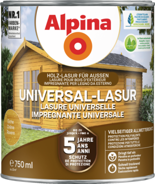 Alpina Holz Universal-Lasur ist der Allwetterschutz für eine Vielzahl von Holzobjekten. Hochwertige Alkydharze schaffen einen Schutz von bis zu 5 Jahren. Die Dünnschichtlasur dringt tief ein und schützt von innen – Reißen oder Abblättern wird zuverlässig verhindert. Die seidenmatte Oberfläche bildet ein atmungsaktives, stark Wasser abweisendes Schutzschild und beugt Grünbelag vor. Alpina Universal-Lasur ist tropf- und spritzgehemmt und ideal für Über-Kopf-Arbeiten. Dank leichter Verarbeitung und schneller Trocknung ist ein Auftrag von zwei Schichten pro Tag möglich.