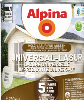 Alpina Holz Universal-Lasur ist der Allwetterschutz für eine Vielzahl von Holzobjekten. Hochwertige Alkydharze schaffen einen Schutz von bis zu 5 Jahren. Die Dünnschichtlasur dringt tief ein und schützt von innen – Reißen oder Abblättern wird zuverlässig verhindert. Die seidenmatte Oberfläche bildet ein atmungsaktives, stark Wasser abweisendes Schutzschild und beugt Grünbelag vor. Alpina Universal-Lasur ist tropf- und spritzgehemmt und ideal für Über-Kopf-Arbeiten. Dank leichter Verarbeitung und schneller Trocknung ist ein Auftrag von zwei Schichten pro Tag möglich.
