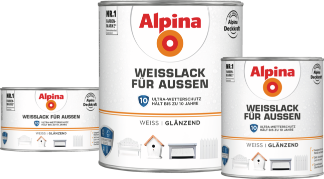 Alpina Weißlack eignet sich mit seinem hohem Weißgrad und seiner ausgezeichneten DeckkraftI ideal für Neu- und Renovierungsanstriche im Außenbereich, z. B. von Gartenmöbeln, Garagentoren, Fallrohren, Treppengeländern und Zäunen. Er bietet starken Schutz gegen Witterungseinflüsse und ist stoß- und schlagfest. Die speziellen Inhaltsstoffe des Acryl-Lacks sorgen bis zu 10 Jahre lang für hohe Witterungsbeständigkeit.