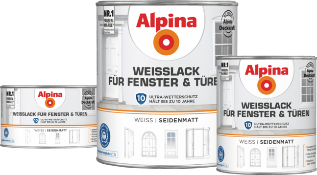 Alpina Weißlack für Fenster und Türen mit integrierter Grundierung ermöglicht hochwertige, wetterbeständige Anstriche im Außen- und Innenbereich. Er eignet sich für Neu- und Renovierungsanstriche, z. B. von Fenstern, Fensterläden, Türen und allen anderen maßhaltigen Bauteilen aus Holz. Der Lack ist vergilbungsbeständig, zeigt beim Lackieren einen sehr guten Verlauf und punktet durch hohe Glanz- und Wetterbeständigkeit.