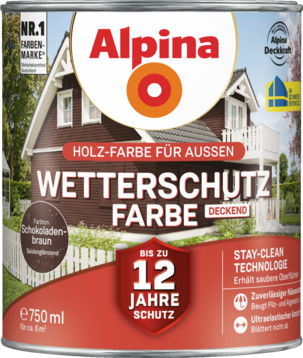 Alpina Wetterschutz-Farbe deckend wurde im schwedischen Alpina Forschungszentrum entwickelt und unter extremen Witterungsbedingungen getestet. Die neuartige Stay-Clean Technologie vermindert die Schmutzanhaftung deutlich und schafft eine lang anhaltende, saubere Oberfläche. Der Schmutz wird beim nächsten Regen einfach abgewaschen. Alpina Wetterschutz-Farbe deckend bildet einen seidenmatten, deckenden, ultraelastischen Anstrich. Dieser blättert nicht ab und erzeugt somit einen zuverlässigen Nässeschutz, der bis zu 12 Jahre schützt und Pilz- und Algenbefall vorbeugt.
