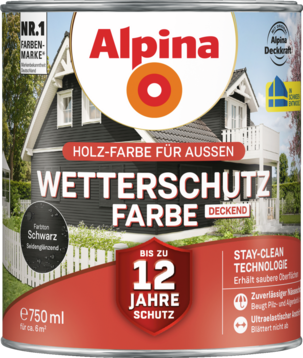 Alpina Wetterschutz-Farbe deckend wurde im schwedischen Alpina Forschungszentrum entwickelt und unter extremen Witterungsbedingungen getestet. Die neuartige Stay-Clean Technologie vermindert die Schmutzanhaftung deutlich und schafft eine lang anhaltende, saubere Oberfläche. Der Schmutz wird beim nächsten Regen einfach abgewaschen. Alpina Wetterschutz-Farbe deckend bildet einen seidenmatten, deckenden, ultraelastischen Anstrich. Dieser blättert nicht ab und erzeugt somit einen zuverlässigen Nässeschutz, der bis zu 12 Jahre schützt und Pilz- und Algenbefall vorbeugt.