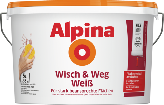 Alpina Wisch & Weg Weiß ist eine extrem reinigungsfähige Dispersionsfarbe. Dank ihrer hohen Nassabriebklasse können haushaltsübliche Flecken einfach abgewischt werden und die Wand strahlt weiter in schönstem Weiß. Zudem ist Alpina Wisch & Weg Weiß besonders schmutzabweisend.