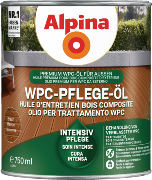 | Untergrund | Alpina WPC-Pflege ist für WPC im Außenbereich geeignet. Für Neu- und Erneuerungsanstriche, z. B. WPC-Böden, Sichtblenden und Pergolen. |