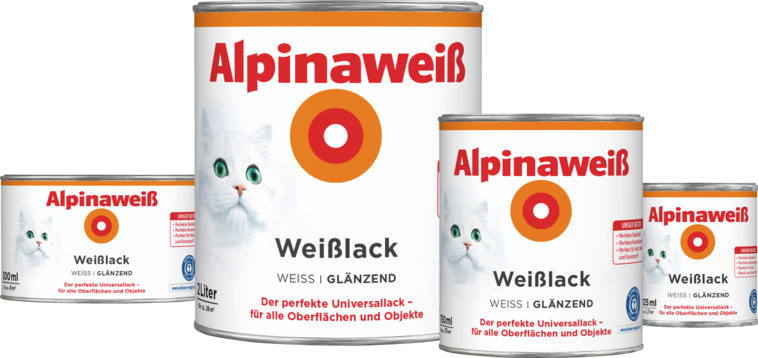 Seit über 100 Jahren steht Alpinaweiß für strahlendes Weiß und ist heute Europas meistgekaufte Wandfarbe. Passend dazu bietet Alpina die ideale Lösung für alle Lackanwendungen rund ums Haus: Der Alpinaweiß Weißlack ist universell einsetzbar, widerstandsfähig und umweltschonend. Der Sprüh-Lack eignet sich für kleine, filigrane und schwer zugängliche Objekte und der SOS Sprüh-Lack ist die perfekte Ergänzung für kleinere Reparaturen. Alle Alpinaweiß Lacke verfügen über den original Weißton der Wandfarbe – ideal für einheitliche, stimmige und hochwertige Lackierergebnisse.