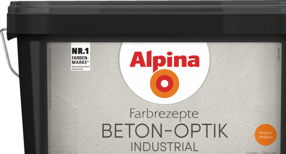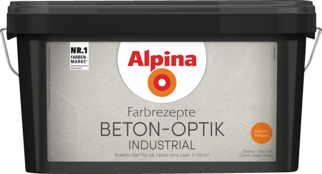 - BETON-OPTIK hellgrau ist eine Effekt-Farbe, die aus zwei Komponenten besteht. Zunächst wird BETON-OPTIK hellgrau Basis aufgerollt und anschließend mit der Alpina Effekt-Kelle gestaltet.
