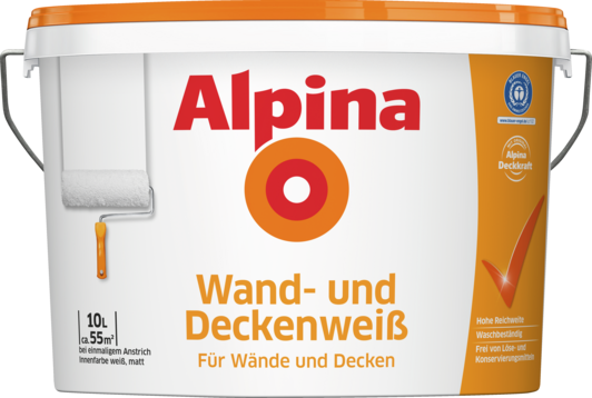 Mit Alpina Wand- und Deckenweiß haben Sie ein Produkt gekauft, das tropfgehemmt eingestellt ist. Dennoch empfehlt es sich, Möbel und Fußböden mit einer Folie abzudecken. Sollte trotzdem einmal ein Spritzer auftreten, bitte gleich mit einem feuchten Schwamm entfernen. Farbe vor Gebrauch aufrühren. Alpina Wand- und Deckenweiß deckt in den meisten Fällen mit nur einem unverdünnten Anstrich. Auf kontrastreichen und stark saugenden Untergründen kann evtl. ein vorheriger Grundanstrich erforderlich sein. Hierfür Alpina Wand- und Deckenweiß max. 5 % Wasser (= 500 ml) verdünnen. Bei einer mit Raumtemperatur von ca. +20 °C ist der Anstrich nach ca. 4 – 6 Std. oberflächen trocken und überstreichbar. Nicht bei Temperaturen unter +5 °C verarbeiten. - Alpina Wand- und Deckenweiß ist mit Alpina C olor (enthält Konservierungsmittel) perfekt abtönbar.