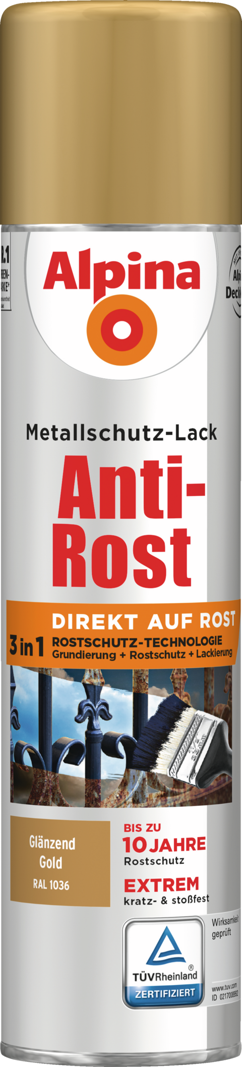 Alpina Anti-Rost Metallschutz-Sprühlack Glänzend Gold Direkt auf Rost - mit 3 in1 Rostschutz-Technologie