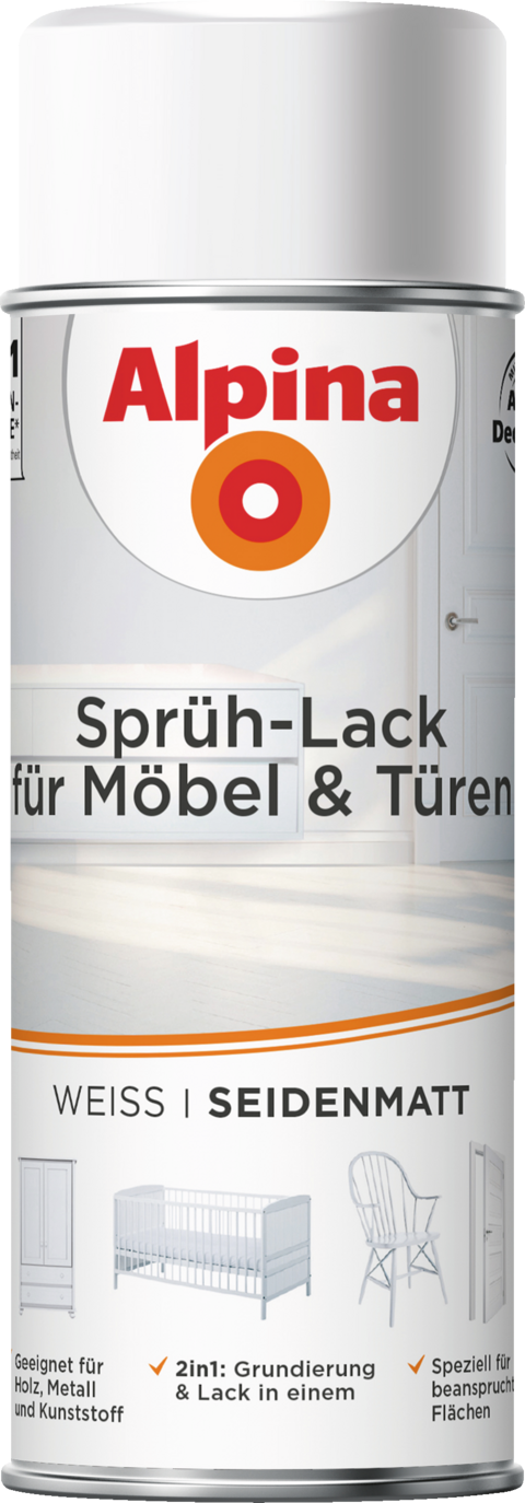 Alpina Sprüh-Lack für Möbel & Türen - weiß, seidenmatt Hochwertiger Schutz für beanspruchte Oberflächen im Innenbereich